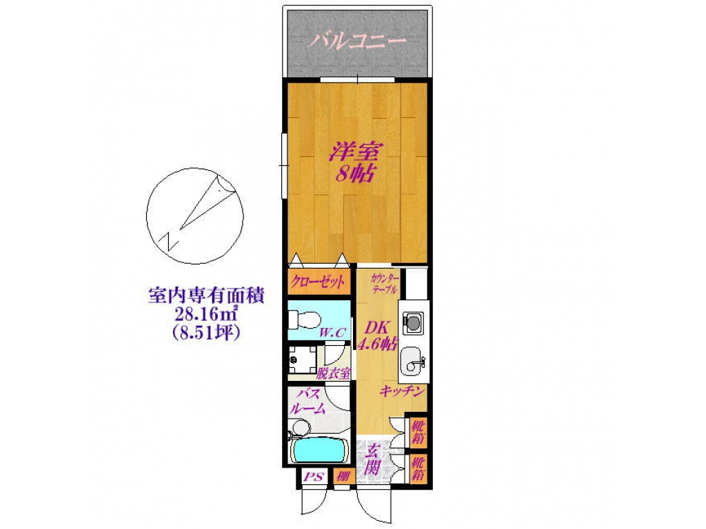 | 間取り | 1K (洋8・K4.6) | 専有面積 | 28.1㎡ |