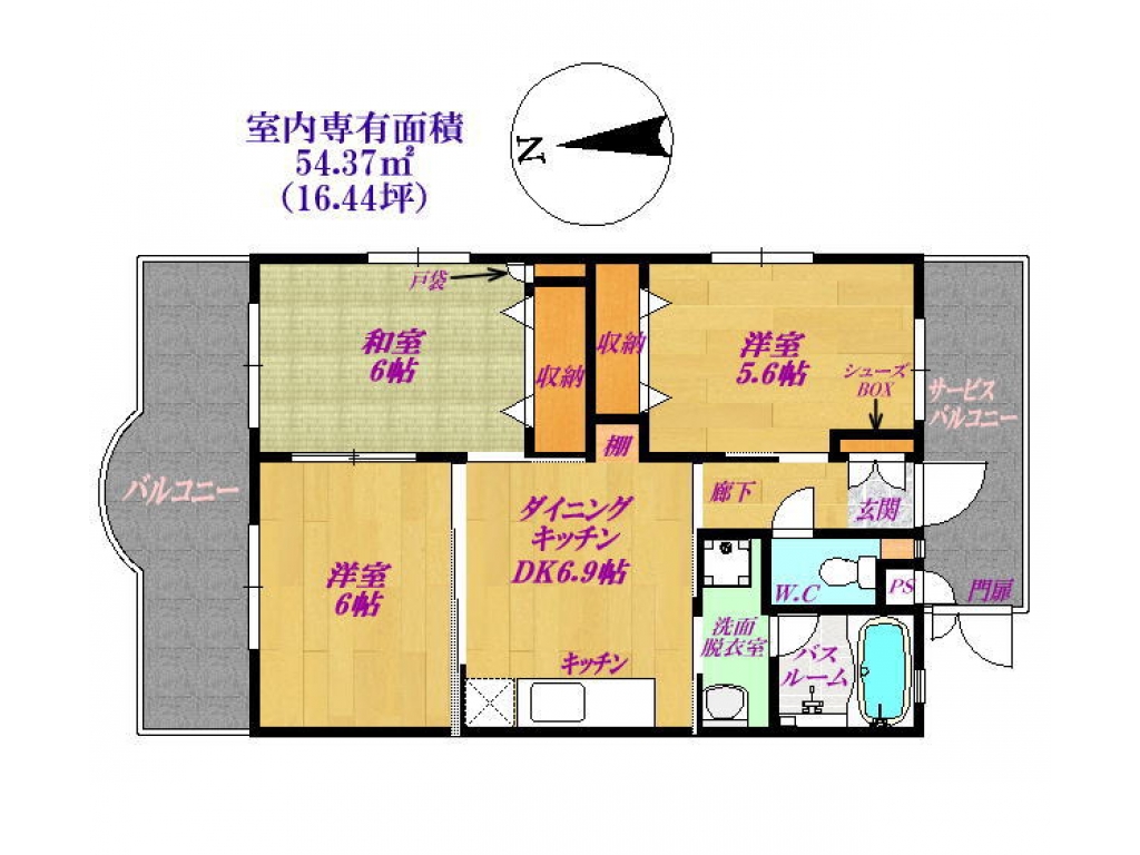 | 間取り | 3DK (洋6・洋5.6・和6・DK6.9) | 専有面積 | 54.37㎡ |