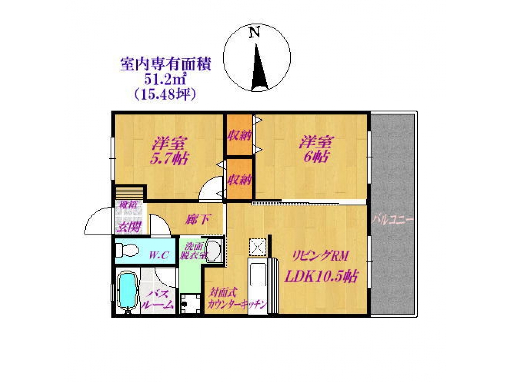| 間取り | 2LDK (洋6・洋5.7・LDK10.5) | 専有面積 | 51.2㎡ |