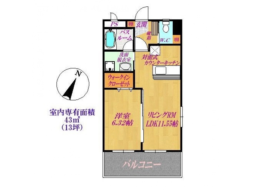 | 間取り | 1LDK (洋6.3・LDK11.5) | 専有面積 | 43㎡ |