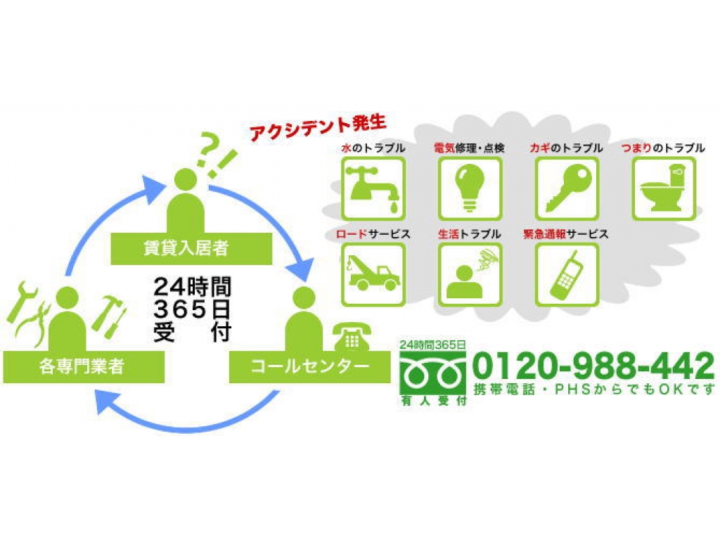 水まわりのトラブル、カギのトラブルや電気設備などのサポートになります。