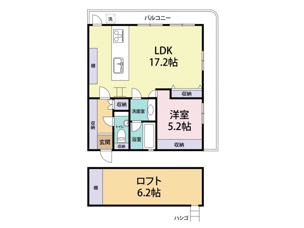 | 間取り | 1LDK (洋5.2・LDK17.2・ロフト6.2) | 専有面積 | 53㎡ |
